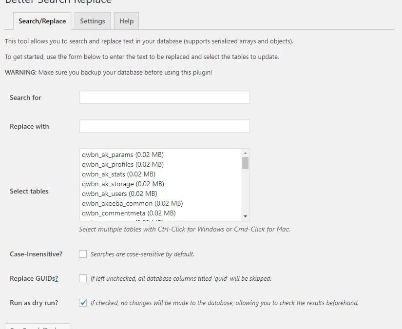Podobnie jak w przypadku Velvet Blues Update URLs po zainstalowaniu wtyczki, która dostępna jest pod adresem: https://wordpress.org/plugins/better-search-replace/ przechodzimy do menu Narzędzia -> Better Search Replace. 1. W polu Search for wpisujemy adres starej nazwy domeny 2. W polu Replace with wpisujemy nasz nowy adres 3. W oknie opcji “Select Tables” – wybieramy wszystkie tabele- wszak chcemy by wszystkie referencje w całej bazie danych zostały podmienione. 4. Wtyczka ta pozwala na tzw. ‘dry run’, co oznacza, że przed uruchomieniem można najpierw sprawdzić ile zmiennych zostanie podmienionych. Jeśli jesteśmy pewni, że chcemy by wtyczka podmieniła wszelkie stare URLe na nowe- odznaczamy opcję “Run as dry run?” i naciskamy przycisk “Run