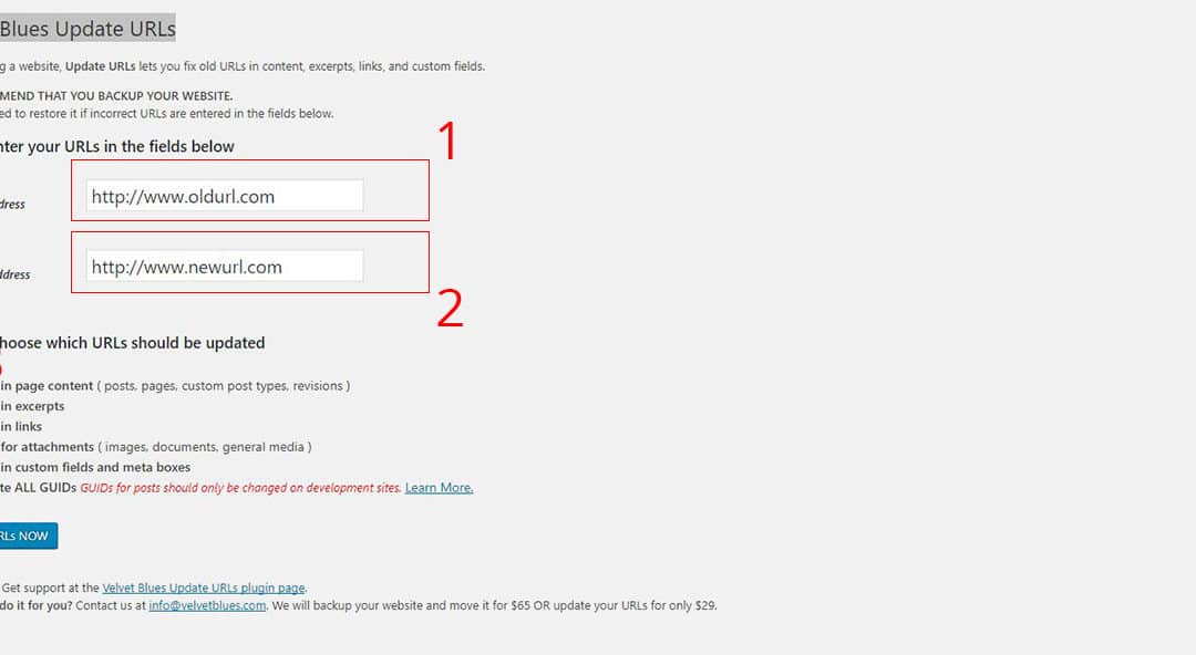 Wtyczka ta dostępna pod adresem: https://wordpress.org/plugins/velvet-blues-update-urls/ jest najczęściej używaną i najbardziej chwaloną opcją. Po zainstalowaniu tej wtyczki przechodzimy do menu Narzędzia -> Update URLs. 1. W polu Old URL wpisujemy nasz stary adres domeny 2. W polu New URL wpisujemy nasz nowy adres domey 3. Zaznaczamy wszystkie opcje oprócz ostatniej “Update ALL GUIDs”. Na koniec naciskamy przycisk “Update URLs NOW”. Po chwili wszystkie referencje do starej domeny powinny zostać usunięte z bazy.